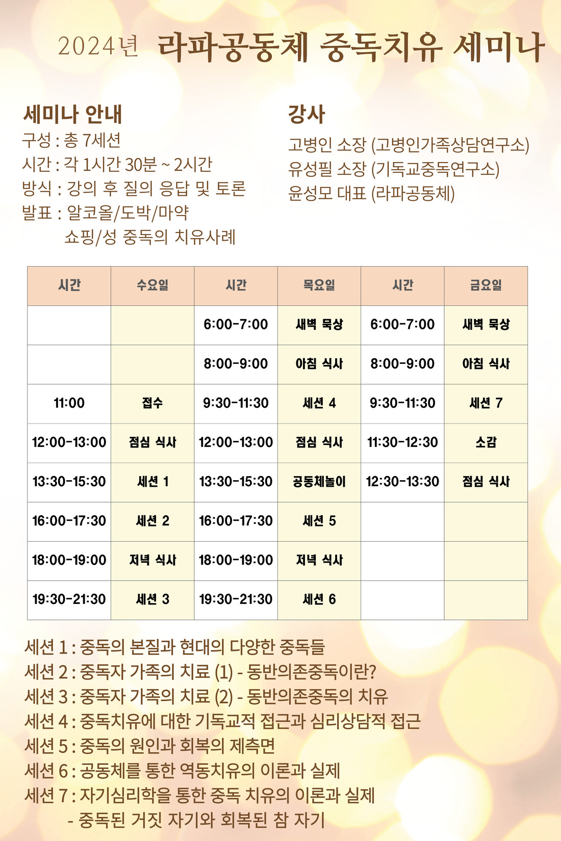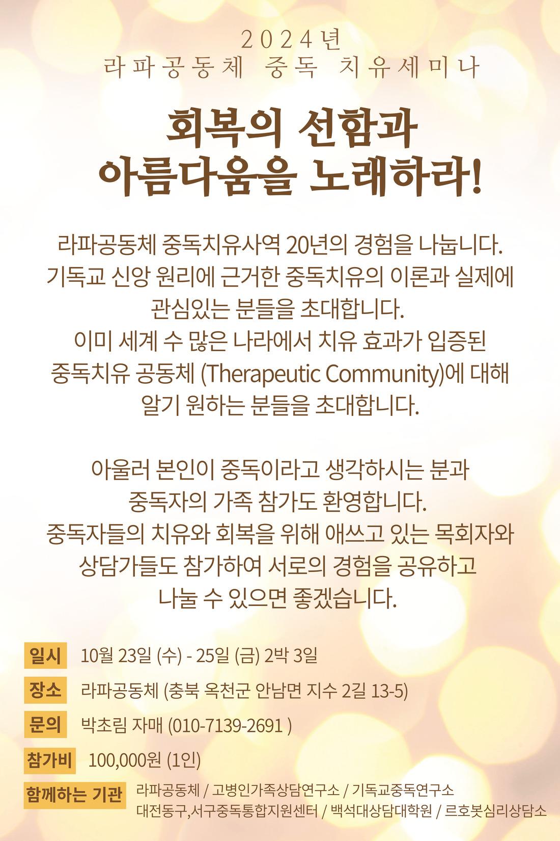 2024년 라파공동체 중독 치유 세미나, 팜파티 안내라파공동체2026.03.28 15:232 안녕하세요! 회복을 향한 첫 걸음, 회복을 살아가는 한 걸음을 살아가는 우리들의 이야기를한 곳에서 모아 듣고 나누는 시간을 가지려 합니다. 23일 (수) - 25일 (금) : 세미나 / 26일 (토) - 27일 (주일) : 팜파티" 회복의 선함과 아름다움을 노래하라! " 라는 주제와 같이 우리의 회복 여정을함께 노래하는 귀한 시간 보내기를 소망합니다. 감사합니다.